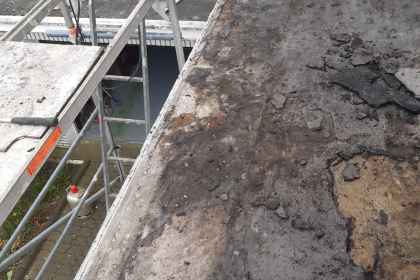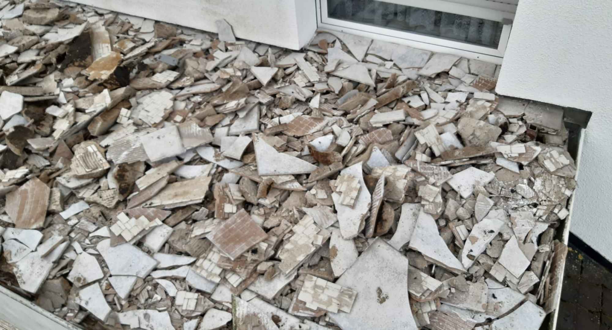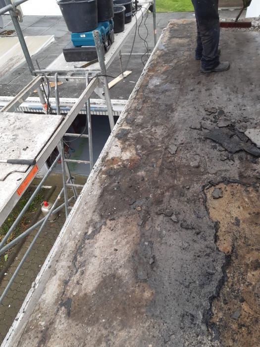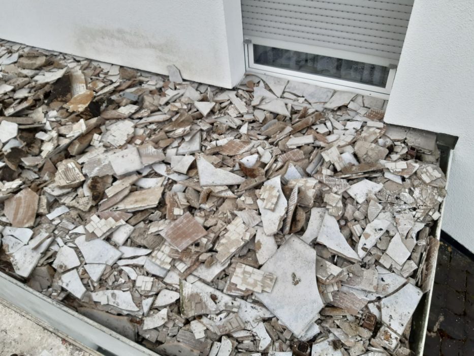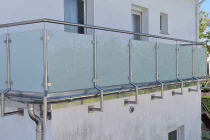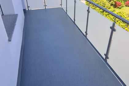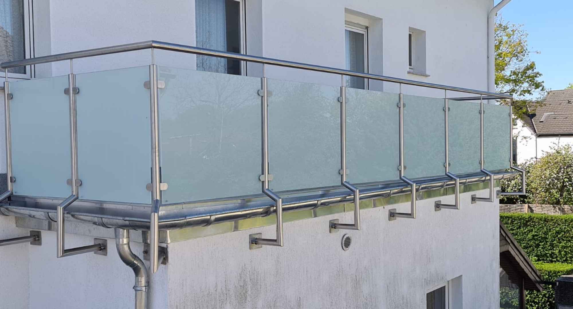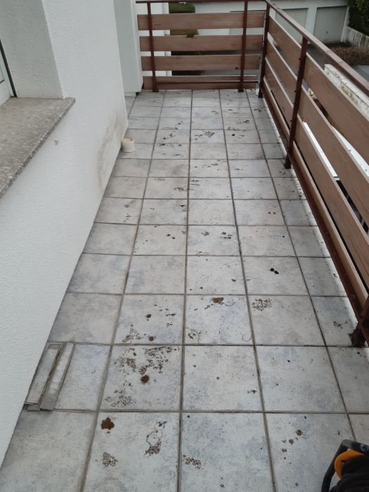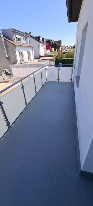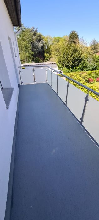Hier sehen Sie ein Objekt in Haan mit Vorher- und Nachher Bildern, welche Ihnen eine interessante Möglichkeit zeigen, was im Bereich der Balkonsanierung möglich ist. Bei diesem Objekt wurde zuerst der alte Bestand inkl. der Geländer abgerissen, ebenfalls der Fliesen-, Estrich- und Abdichtungsbelag. Beim Neuaufbau wurde darauf geachtet, das die Betondecke gedämmt ist, unterhalb der Wärmedämmung wurde eine Bauder-Dampfsperre aufgebracht. Oberhalb der Wärmedämmung erfolgte nun der Aufbau der Triflex-Beschichtung mit einer Lastverteilschicht aus einer Betonplatte 2cm und dem Triflex-Abdichtungssystem BTS mit Chipseinstreung. Hier wurde die Farbe 7035 Qarz gewählt. Viele Varianten der Triflex-Beschichtung sind möglich, u.a. Farben, Oberlächen und Rutschklassen. Gerne beraten wir Sie zu all Ihren Fragen, sprechen Sie uns an! Die Geländer, welche Sie hier sehen, best. aus senkr. Pfosten und Handlauf aus Rundrohr ø 42,4mm. Pfosten mit Verkröpfung um die Regenrinne geführt und vor Kopf befestigt. Füllung der Geländerfelder mit Glasscheiben 8,76mm, VSG/ESG mit matter (blickdichter) Folie. Je Glasscheibe 4 Stk. zugelassene Glashalter. Komplett Edelstahl 1.4301, Korn 240, matt gebürstet.